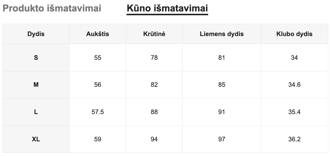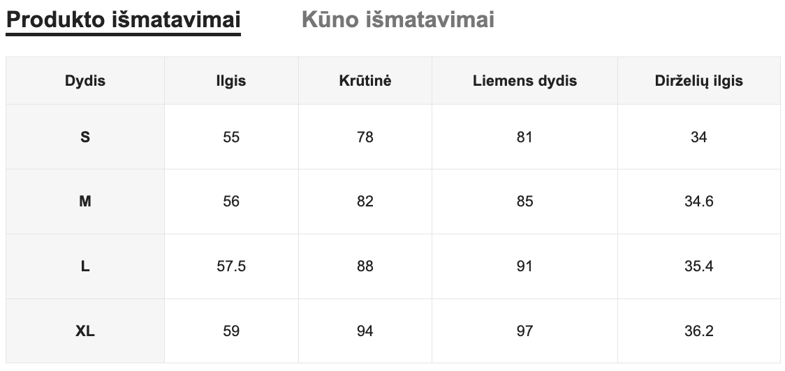 Dydžių lentelę galite rasti paskutinėse kiekvienos prekės nuotraukose.