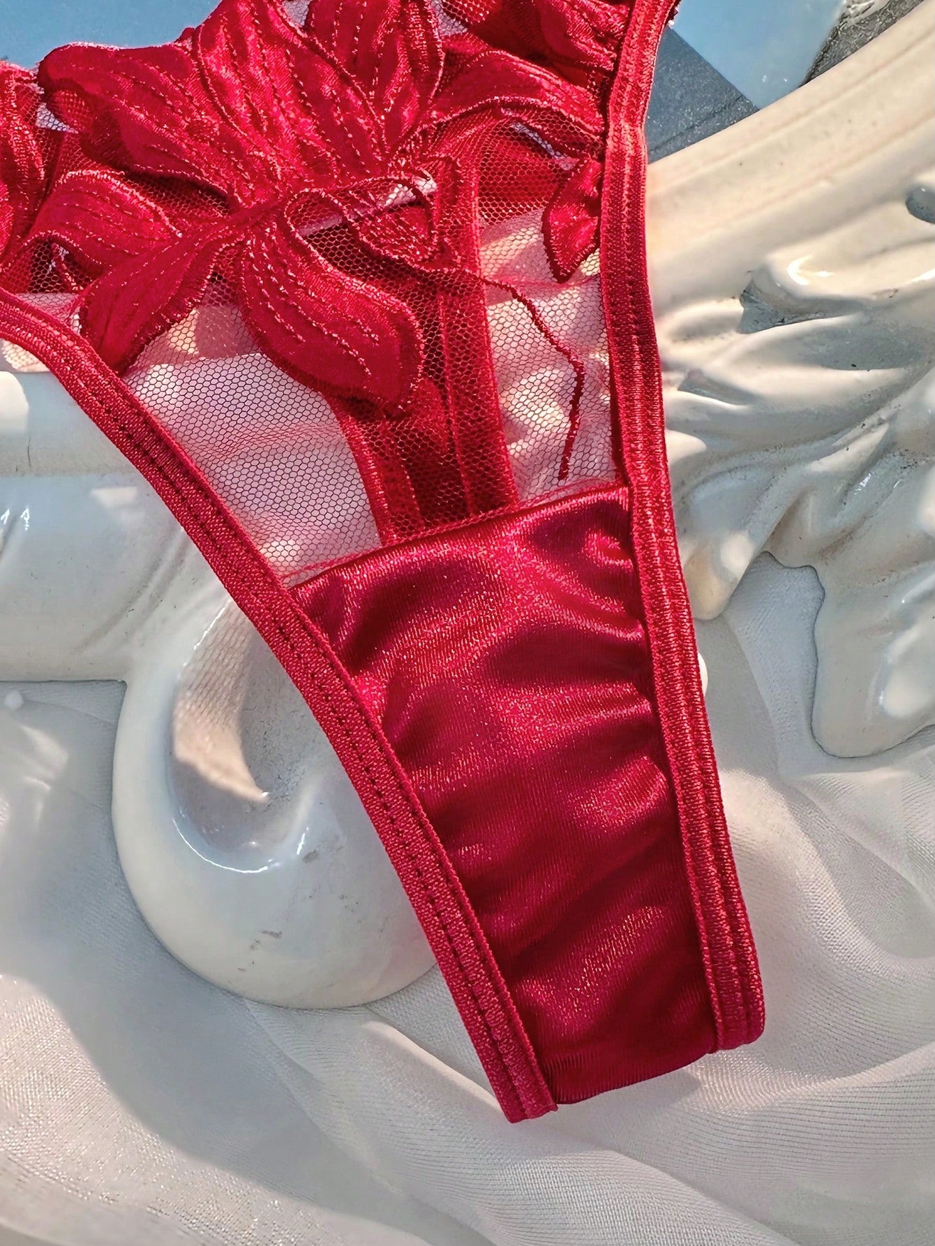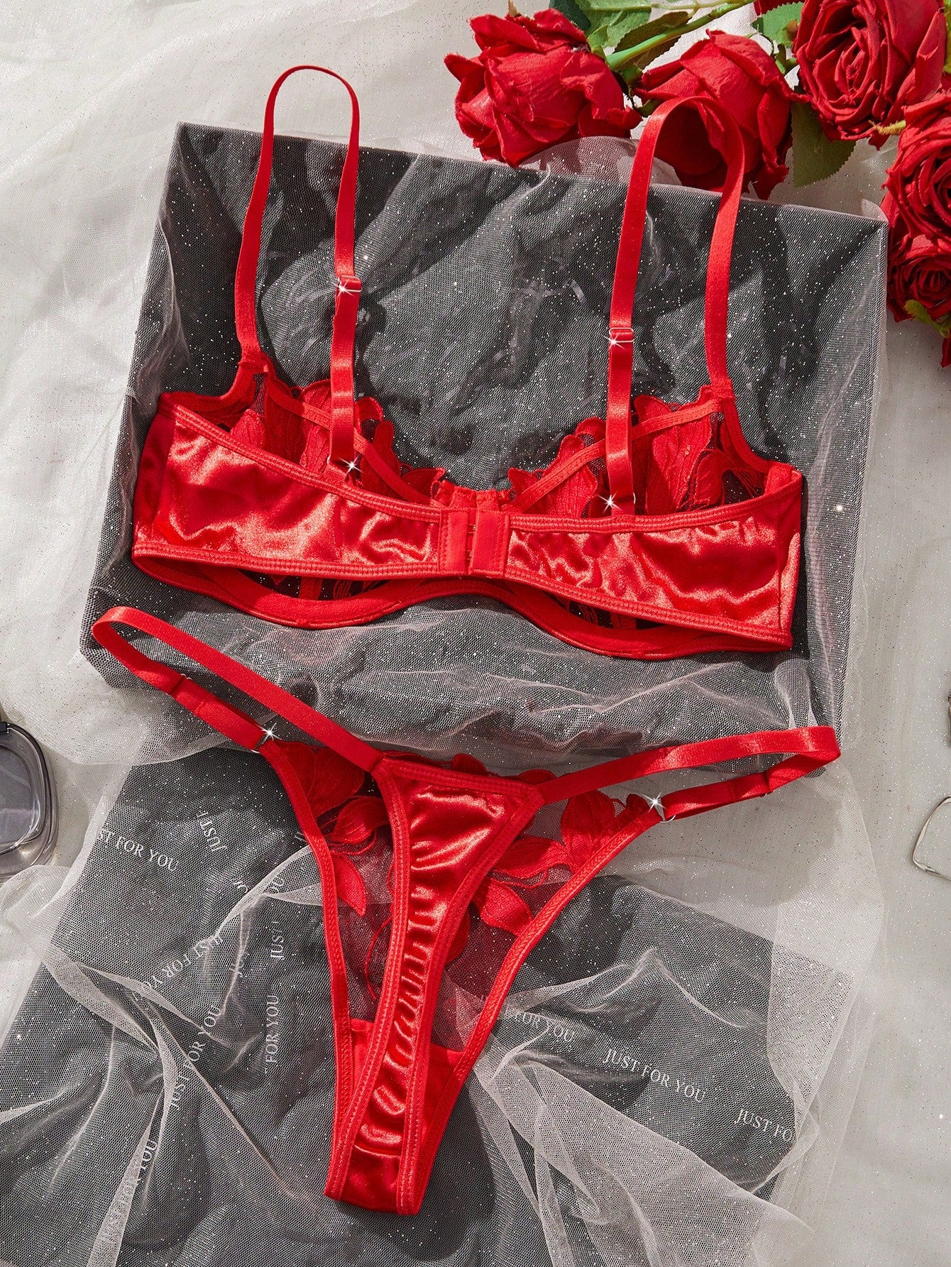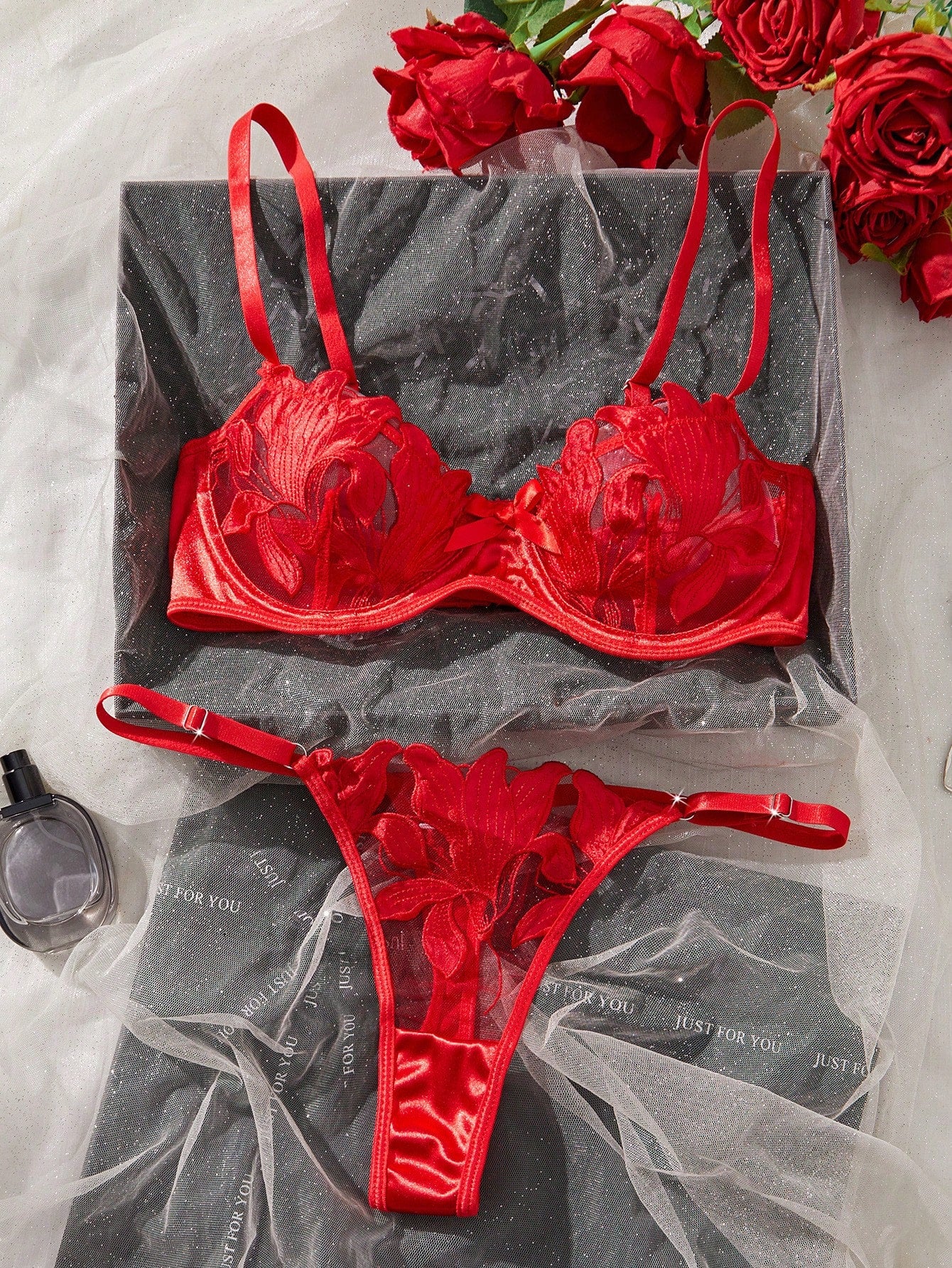 Žavus ir moteriškas, nėriniais ir satino detalėmis puoštas liemenėlės ir kelnaičių komplektas, dailiai įreminantis figūrą ir suteikiantis seksualumo bei pasitikėjimo savimi.