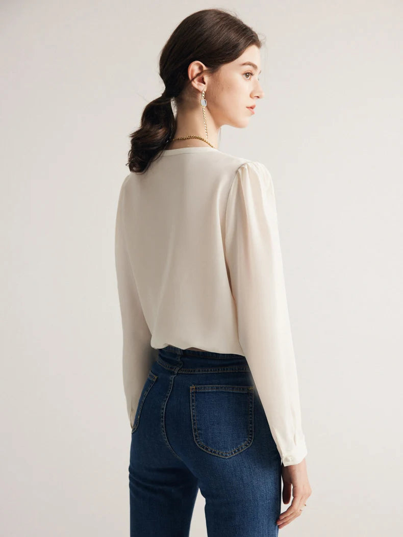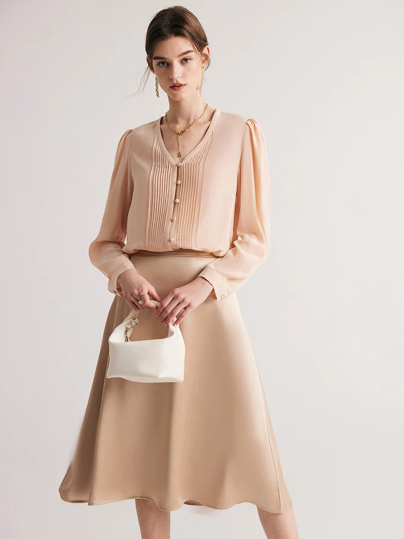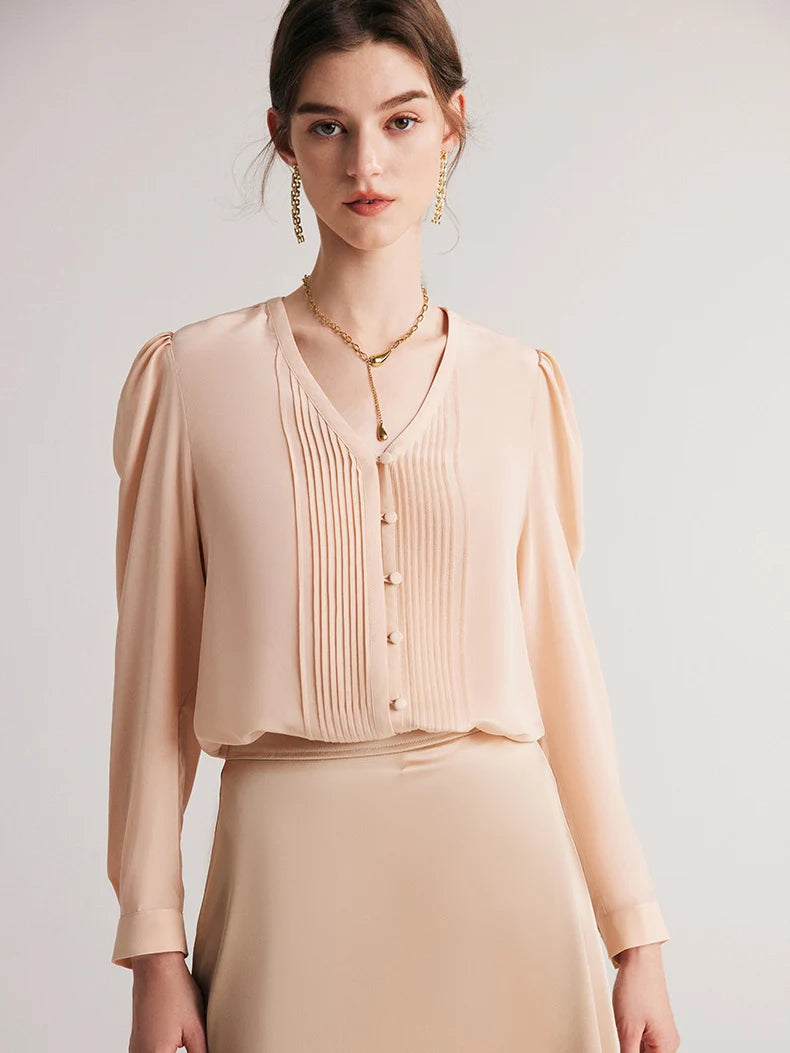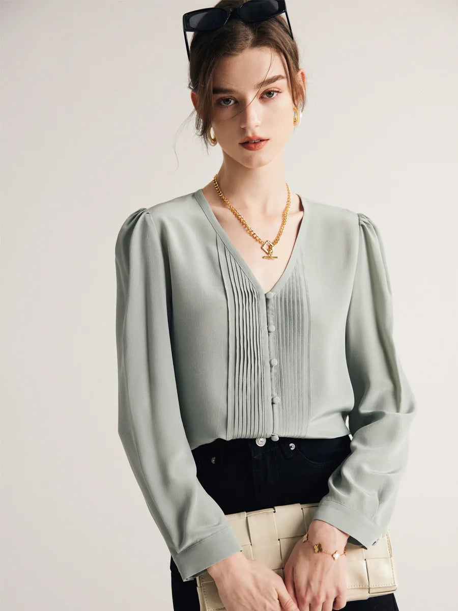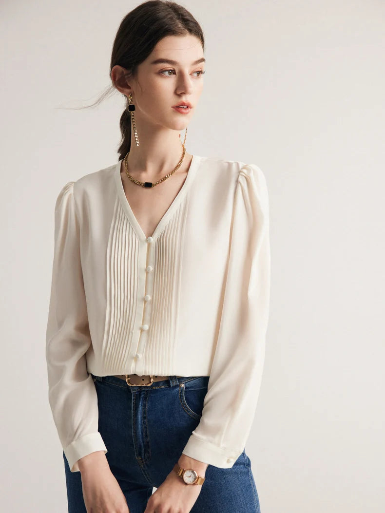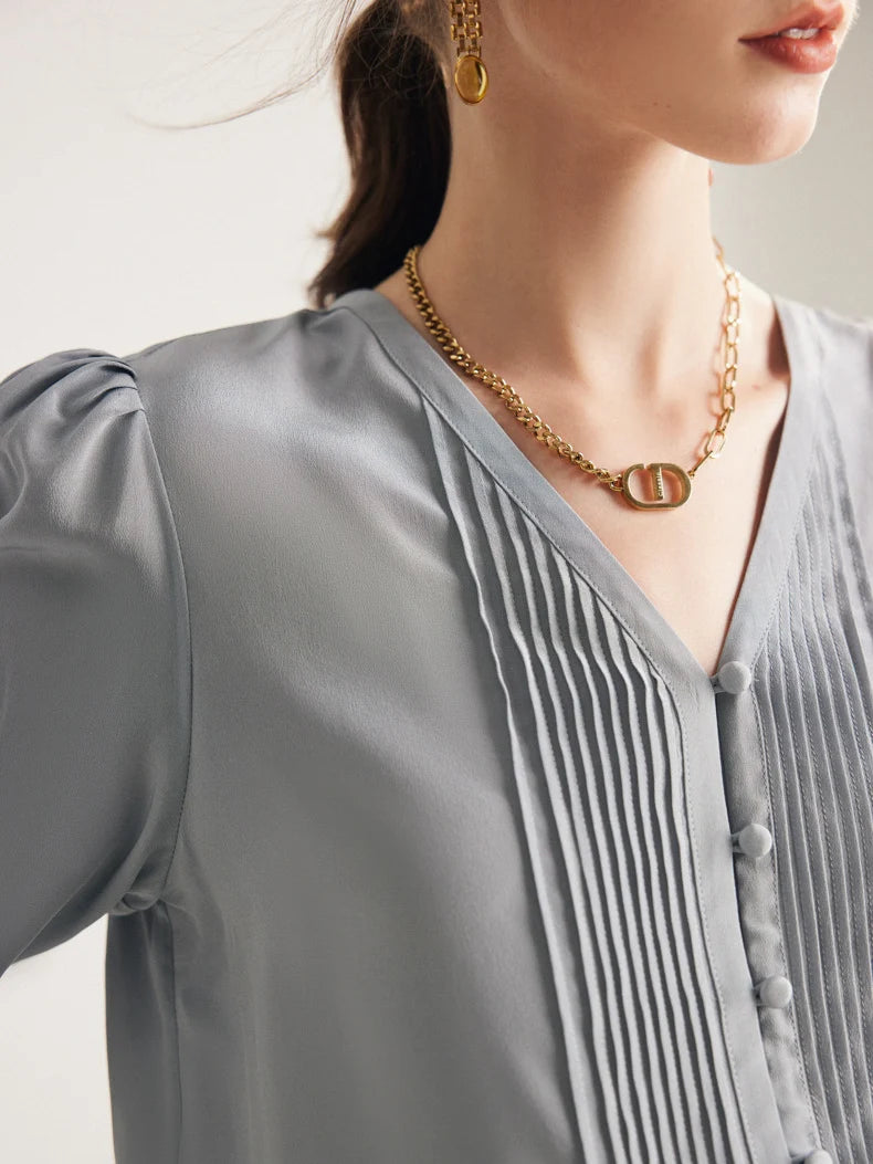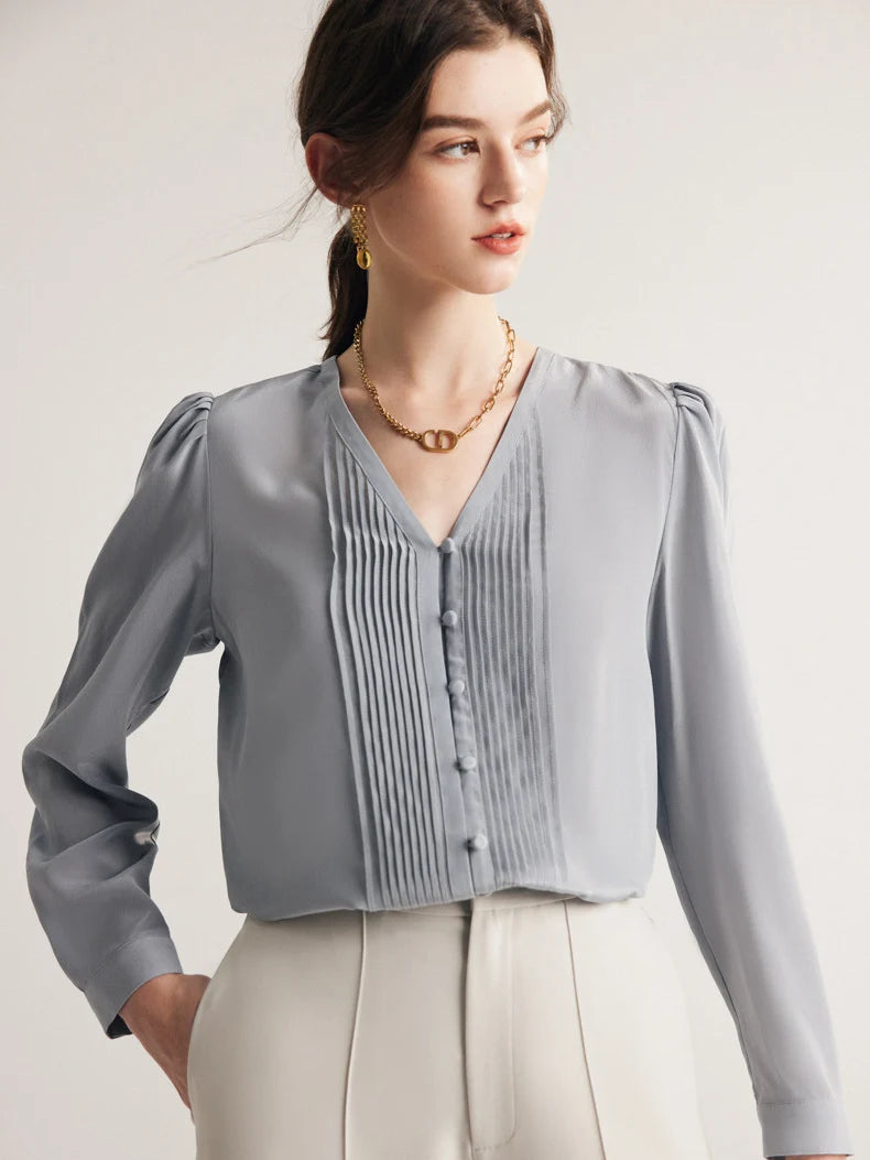 Elegantiška ir laikui nepavaldi palaidinė, pasiūta iš 100% Mulberry šilko. Lengva, švelni ir kvėpuojanti medžiaga užtikrina komfortą visą dieną. Priekinės dalies klostuotas dizainas suteikia išskirtinumo ir rafinuotumo. Puikiai tinka tiek darbui, tiek išskirtinėms progoms.