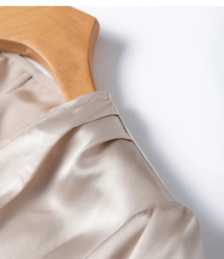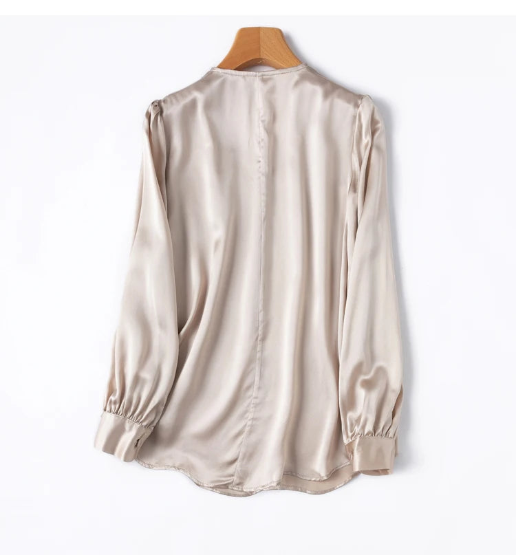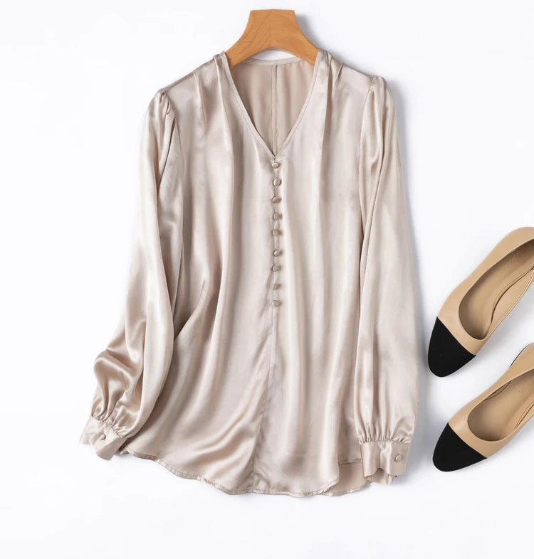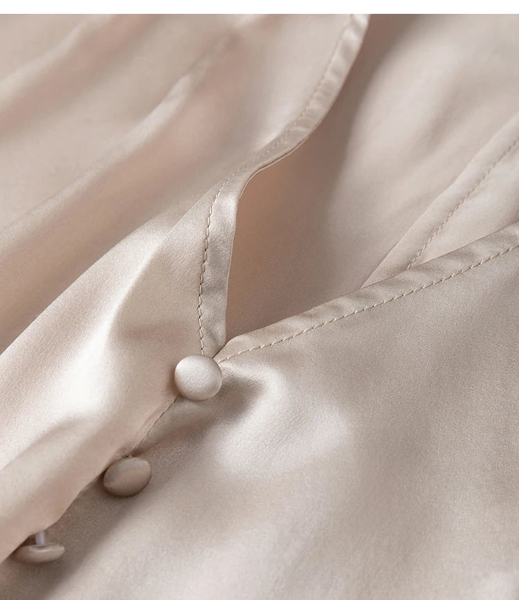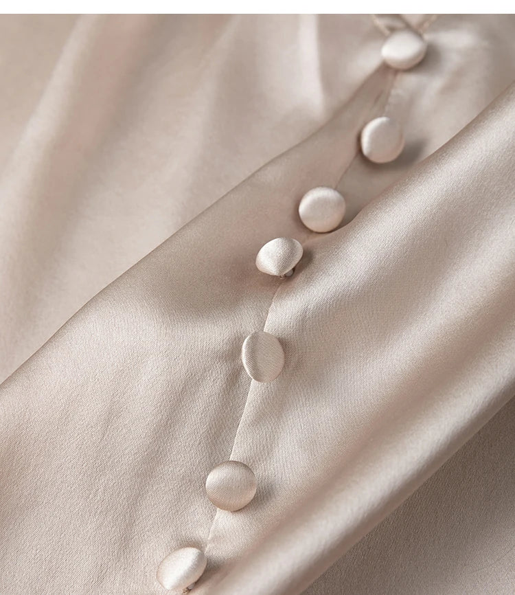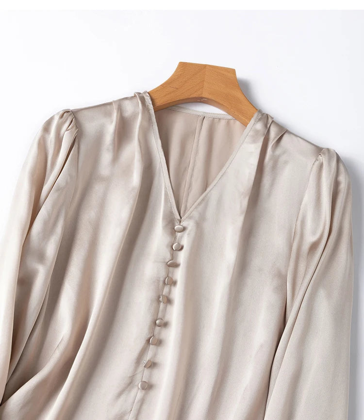 Elegantiška ir laiko nepavaldi moteriška palaidinė, pasiūta iš aukštos kokybės 100% Mulberry šilko. 20 momų tankio audinys užtikrina švelnumą, tvirtumą ir prabangų kritimą. Palaidinė dekoruota subtiliomis sagutėmisties apykakle – rafinuota detalė, kuri išskiria ją iš kitų.