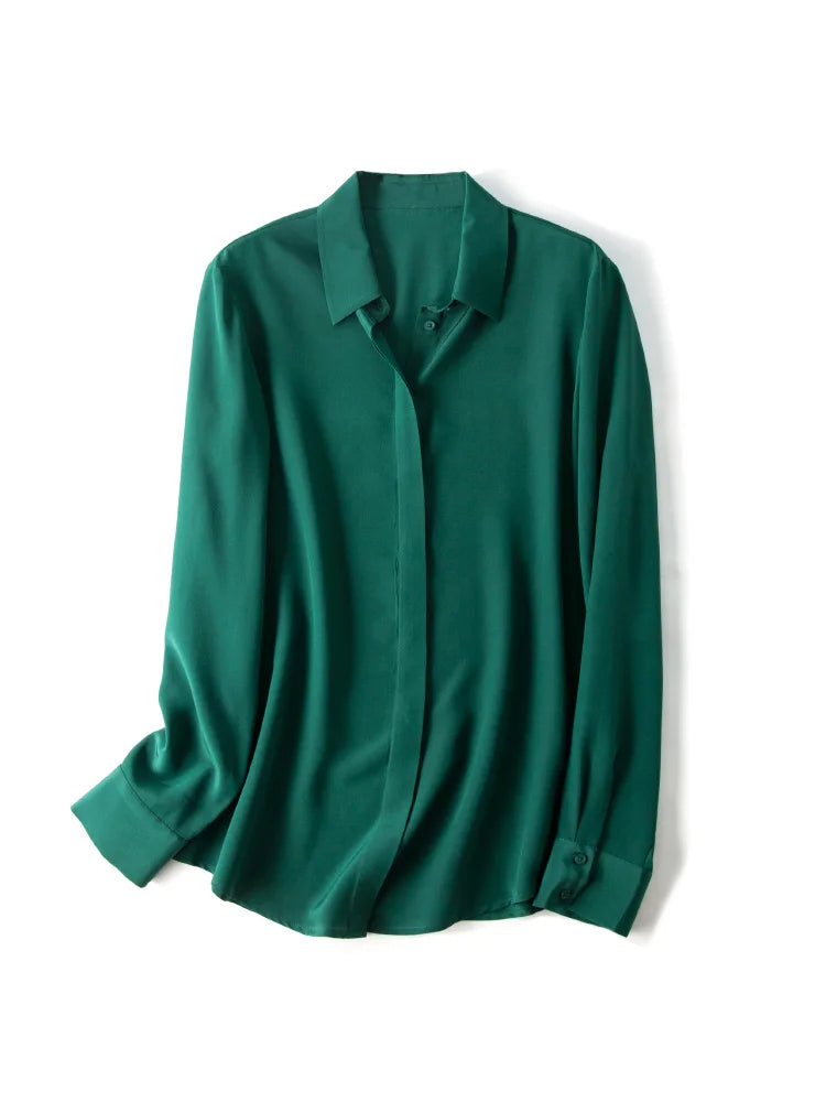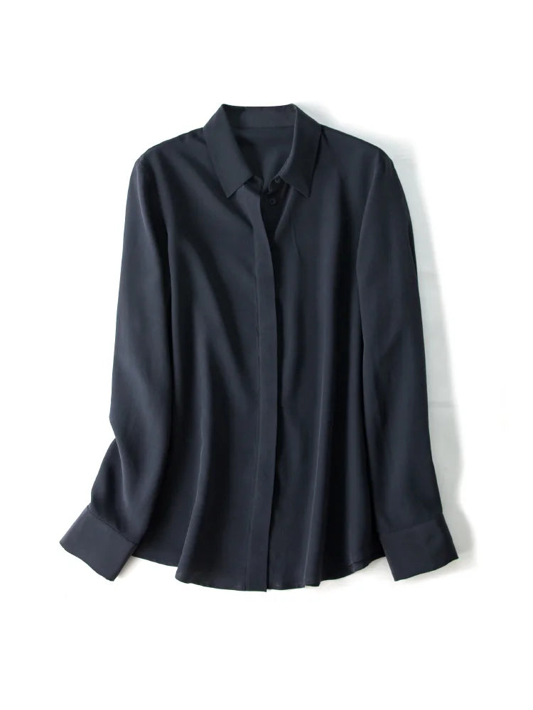 Aukščiausios kokybės moteriški marškiniai, pagaminti iš 93% Mulberry šilko, 7% spandex. 20 momų. Baltos spalvos ir prabangios tekstūros, klasikinio kirpimo, su sagomis priekyje. Lengvi, švelnūs ir elegantiški – puikiai tinka tiek kasdieniam, tiek formalesniam įvaizdžiui. Ilgaamžiai ir prabangūs – tikra spintos klasika.